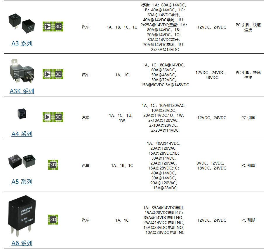 ● A1 系列的开关容量高达 30A,适用于汽车和车灯配件。安装方法为 PC 引脚或快速连接。触点排列选项为 1A 或 1C,线圈功率选项为 1.2W 或 1.5W。A1 系列尺寸为 22.8 x 15.3 x 25.8 毫米。