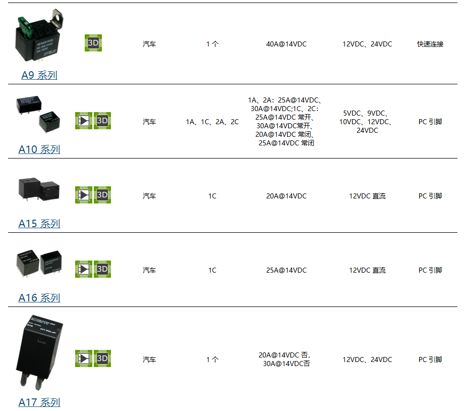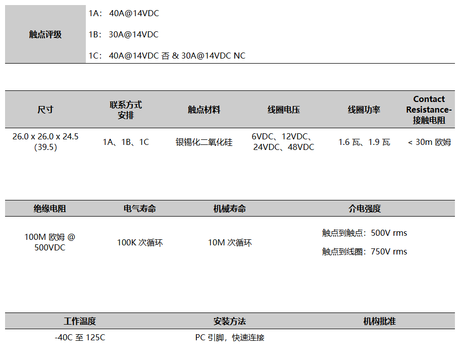 ●A2 系列 40A 汽车继电器提供两种安装法兰选项,还提供带罩版本。开关容量大,高达 40A,线圈电压范围为 6VDC 至 48VDC。继电器线圈功率选项为 1.6W 或 1.9W。触点额定值为 1A、1B 或 1C。A2 系列 40A 继电器尺寸为 26.0 x 26.0 x 24.5mm