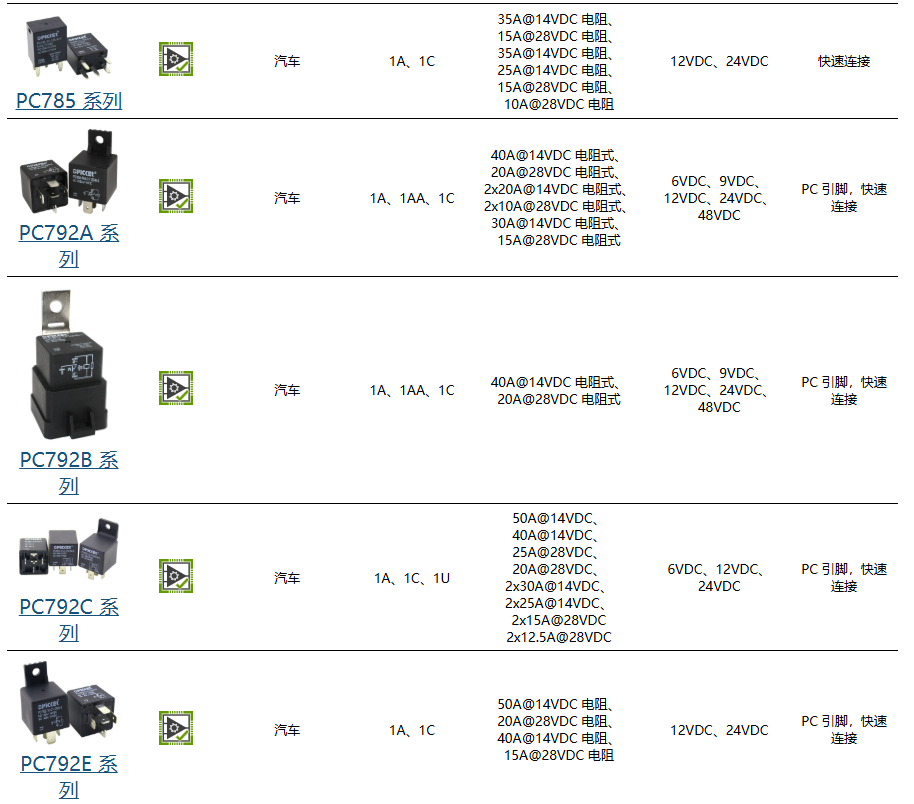 ●A3 系列具有高达 80A 的大开关容量,带有 PC 引脚或快速连接安装,已通过 QS-9000 和 ISO-9002 认证。A3 系列提供标准和重型触点额定值,提供 1A、1B、1C 或 1U 三种规格。线圈电压选择为 12VDC 或 24VDC,线圈功率为 1.8W。这款 12VDC 继电器的尺寸为 28.5 x 28.5 x 26.5mm。