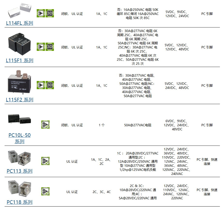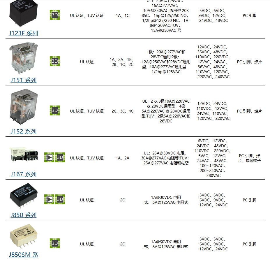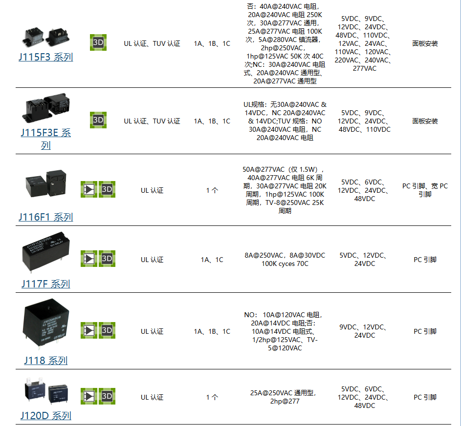 ●J115F3 系列继电器采用重量轻、尺寸小的封装,可提供高达 40A 的重触点负载和强大的抗冲击和抗振动能力。这款 PC 引脚安装继电器提供 1A、1B 或 1C 触点排列,线圈电压范围为 5VDC 至 277VAC,直流线圈功率为 .60W 或 .90W,交流线圈功率为 .2VA。UL 认证继电器的尺寸为 32.4 (50.0) x 26.8 x 28.1mm。J115F3 提供安装片,并提供扁平版本。该线圈电压继电器的机构认证是 UL E197852 和 T。如果您对具有防尘罩选项的东西感兴趣,请查看这款小型 UL 继电器。